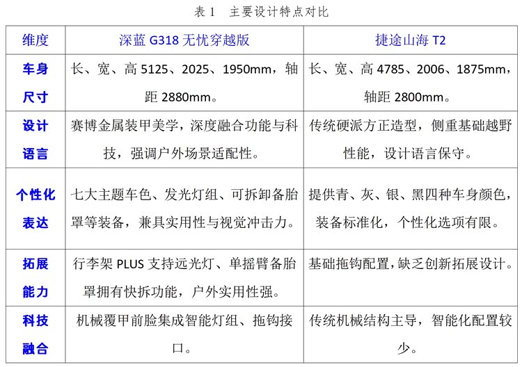 深藍G318通過“科技+美學+場景”三位一體的設計策略,重新定義了科技硬派SUV的標桿——它不僅是交通工具,更是戶外生活方式的載體; 而捷途山海T2則以“實用至上”為核心,延續(xù)傳統(tǒng)硬派SUV的可靠基因,但在設計創(chuàng)新、場景適配與用戶體驗層面仍需突破。對于追求“既有硬核性能,又能融入都市審美”的用戶,深藍G318是更優(yōu)選擇;若用戶更看重“基礎越野能力+低門檻”,捷途山海T2則提供了更親民的方案。