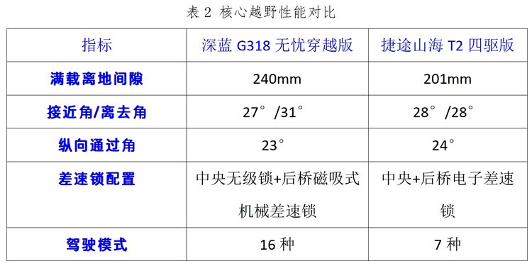 在硬派越野與城市通勤的平衡較量中,深藍G318無憂穿越版與捷途山海T2展現出截然不同的產品特性。如表2所示,深藍G318在性能指標上全面占優(yōu):配備同級唯一CDC空氣懸架,離地間隙最高240mm,配合27°接近角、31°離去角,相較山海T2優(yōu)勢顯著。這種設計差異直接體現在復雜地的形應對能力上——深藍G318無憂穿越版可輕松跨越一定高度的障礙,同樣路況山海T2需減速至15km/h以下通過。