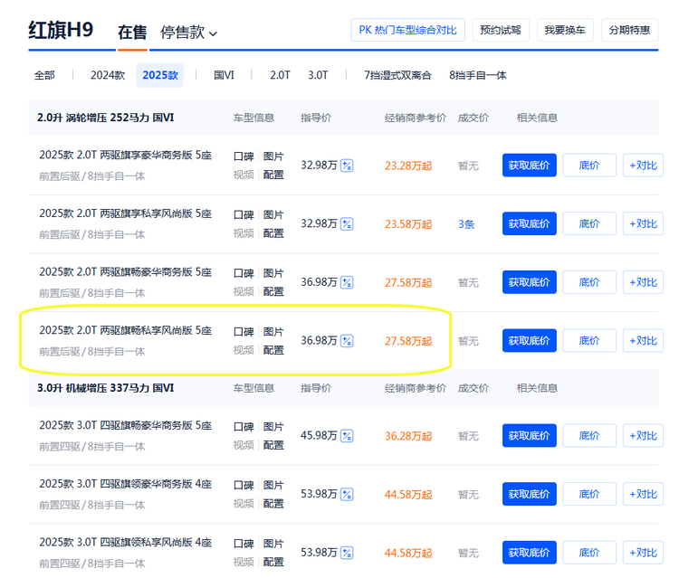 在國產品牌強調新中式豪華的這波趨勢里,紅旗H9是典型的代表。比如,紅旗H9 2025款 2.0T 兩驅旗暢私享風尚版 5座,是國產品牌里少有的能在30萬以內落地、又能把50萬級排面盡量給到的一款車型。官方指導價36.98萬元,但目前終端優惠可以做到27.58萬元裸車價,這就直接把它推到了德系BBA高低功率分界線以下。