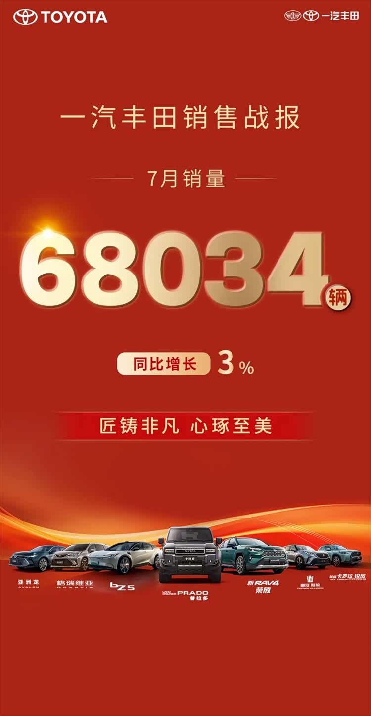 8月1日,一汽豐田率先公布7月銷售成績;7月銷售新車68034輛,同比增長3%,繼上半年同比增長16%之后,再次將正增長時間紀錄拉長,說明其“合資新力量”的成色更足了。