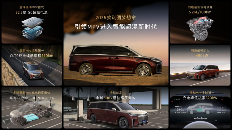 2026款夢想家首搭嵐海智能超混系統,作為全球首款800V智能超混MPV,以“快補能、長續航、低能耗”三位一體突破性能邊界,真正實現全場景純電駕乘。