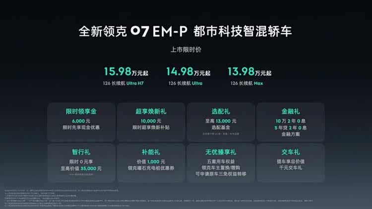 全新有為,極智新境。9月25日,都市科技智混轎車——全新 領克07 EM-P(參數|詢價)正式上市。新車共推出126長續航Max、126長續航Ultra、126長續航Ultra H7三款配置版本,上市限時價13.98萬元起。同時,全新領克07 EM-P還準備了限時領享金、超享煥新禮、選配禮、金融禮、智行禮、補能禮、無憂臻享禮、交車禮在內的8重限時福利。