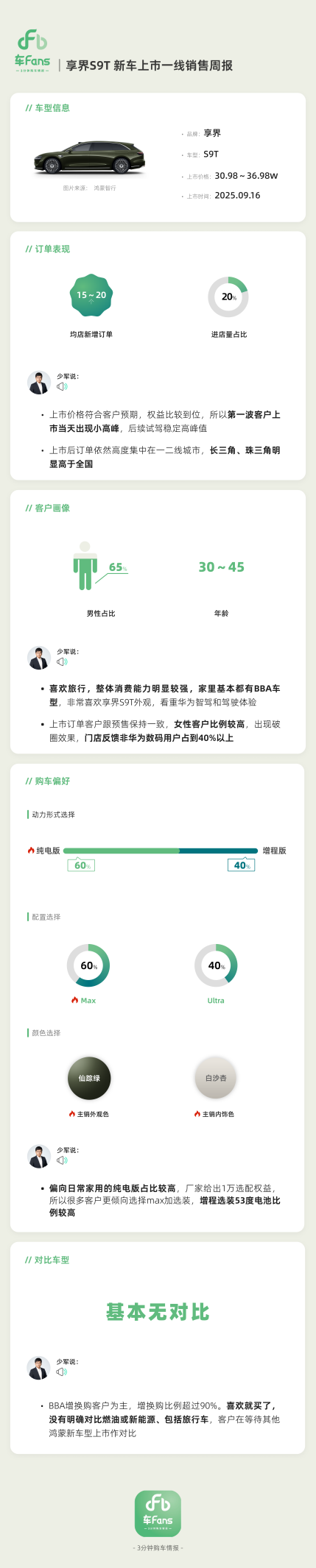 據行業調研顯示,首批享界S9T大定用戶男女比例為6:4,其中女性占比較高,用戶以BBA增換購為主,高顏值、華為智駕、底盤操控是核心購買因素。首周大定訂單突破13000臺,充分體現了旗艦9系強大的市場吸引力及車型破圈效應。
