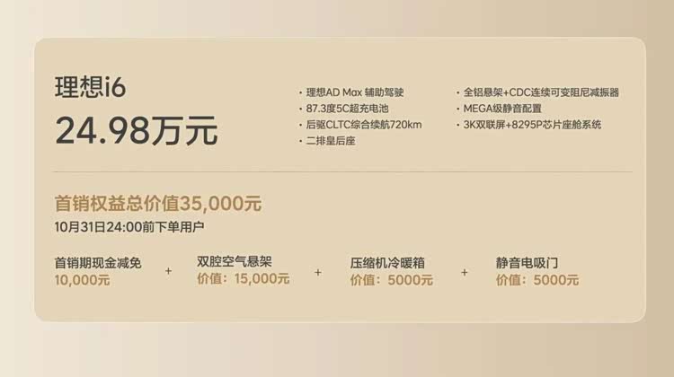 當(dāng)然理想這次還是清醒的,全系只提供一款車型,售價24.98萬元,在首銷期提供1萬元現(xiàn)金減免,贈送雙腔空懸、冷暖箱和電吸門,后排娛樂屏、鉑金音響、四驅(qū)為選裝配置,部分顏色與更大輪轂同樣選裝。