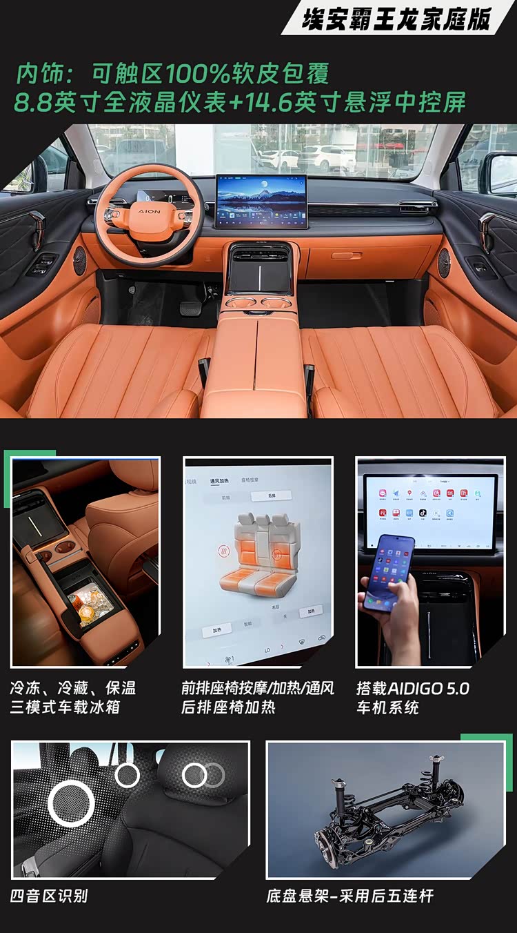 埃安霸王龍家庭版:內飾設計簡潔大氣,觸手可及處百分百內飾軟皮包覆,應用了嬰兒級的環保材質,同級競品就只有85%的包覆,觸感細膩,看得見的內飾高級感,舒適度也是直接拉滿,在舒適性配置上十分有誠意,上基本做到同級拉滿,同級有基礎舒適性配置座椅通風都配齊,此外還有方向盤加熱、前排座椅按摩、同級唯一的后排座椅加熱,配備冷凍、冷藏、保溫三模式-15°C至50°C的車載冰箱,能完全滿足四季全家出行的舒適體驗,真正把每一分錢都用在出行體驗上。