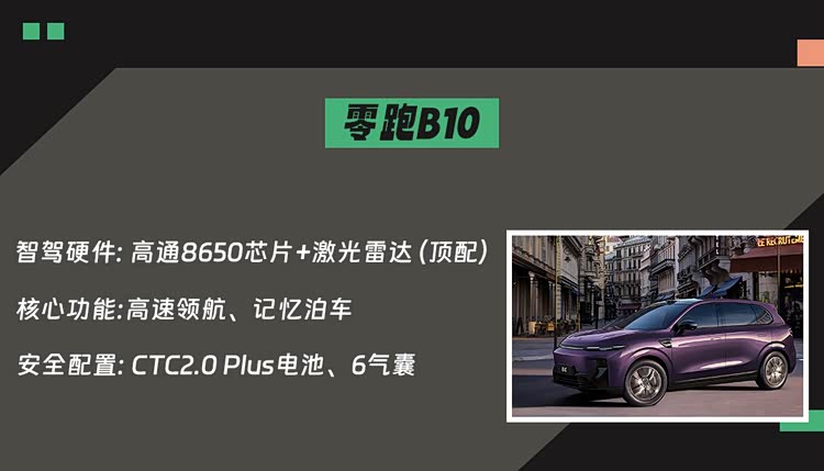零跑B10:配備高通8650芯片與激光雷達(頂配),支持高速領航、記憶泊車功能,采用CTC2.0 Plus電池,配備6安全氣囊,160kW電機動力輸出穩定,滿足日常城市通勤與短途高速出行需求。