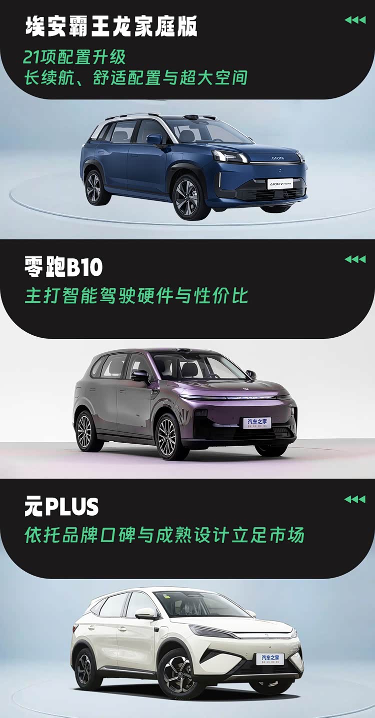 10-15萬A級家用純電SUV市場一直是家用出行的熱門選擇,埃安霸王龍家庭版、 零跑B10(參數|詢價)、比亞迪元PLUS三款車型,憑借不同的產品側重,吸引著各類需求的消費者。埃安霸王龍家庭版比上代升級了21項貼心配置,降價增配,以長續航、舒適配置與超大空間為亮點,零跑B10主打智能駕駛硬件與性價比,元PLUS則依托品牌口碑與成熟設計立足市場。下面將從造型、內飾、動力等維度,拆解三款車型的核心特性,并分析每款車對應的適配人群,為不同需求的用戶提供選購參考。