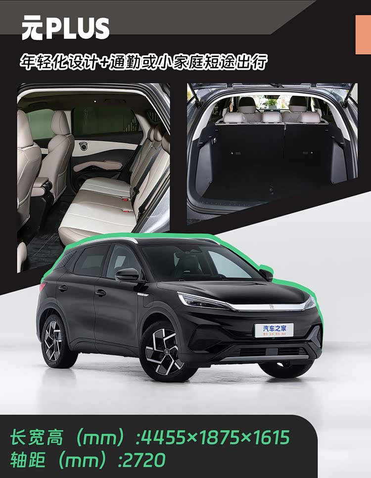 元PLUS:中期改款后采用動感前臉,延續比亞迪家族化風格,車身線條靈動。適合認可比亞迪品牌,喜歡年輕化設計,日常以個人通勤或小家庭短途出行為主的用戶。2720mm軸距滿足主流家用,178cm乘客后排腿部余2拳,后備箱可以契合小家庭短途通勤與偶爾出游場景。