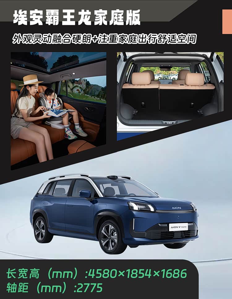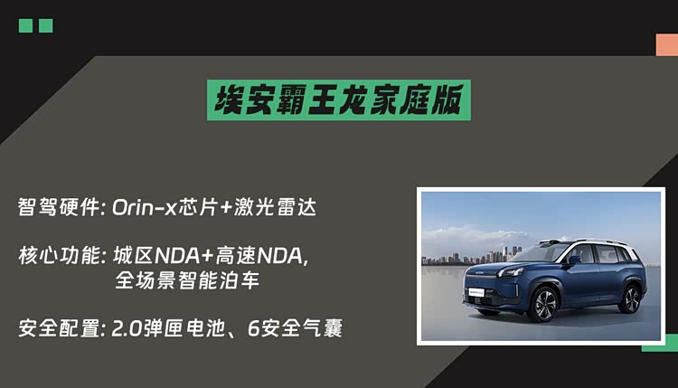 埃安霸王龍家庭版:配備同級算力領先高算力Orin-x 芯片(TOPS 254)與激光雷達,支持城區NDA+高速NDA、全場景泊車等智駕功能,采用2.0彈匣電池,增加電池安全性;動力系統搭載224Ps前驅電機,輸出平順且響應快速。安全方面,同時配備全方位側氣簾,兩側各2.2米長,是同級中體積最大且最長的氣簾,其中還專為兒童設計了二排區域專屬安全氣囊,重點保護兒童的頭頸部。