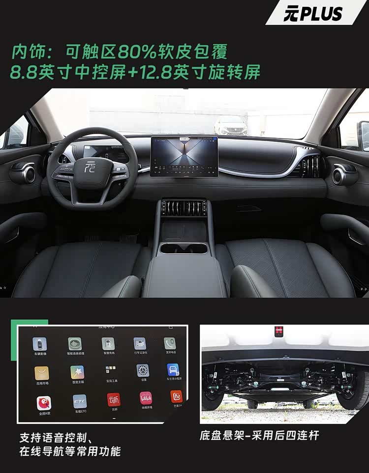 元PLUS:內飾采用環保材料,部分版本使用仿皮座椅,頂配車型配備冷暖冰箱,搭載DiLink 車機系統,8.8英寸中控屏+12.8英寸旋轉屏提升操作便利性,頂配車型提供W-HUD功能,車機支持語音控制、在線導航等常用功能,內飾設計成熟,符合品牌一貫的品質標準。底盤上采用了四連桿,抗側傾能力及顛簸路段的表現也符合這個價位的表現。