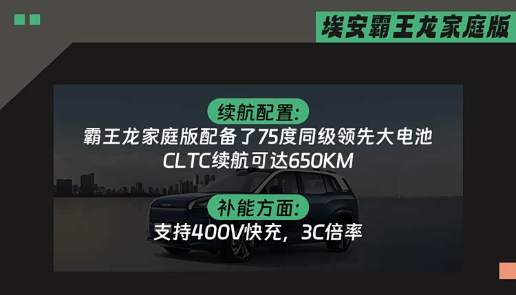 埃安霸王龍家庭版:續航是最貴的配置,600KM續航同級普遍65-68度電池,霸王龍家庭版配備了75度同級領先大電池,CLTC續航可達650KM,一次補能即可滿足日常通勤一周與周末近郊游往返續航。補能方面支持400V快充,3C倍率下充電30%-80%僅需22分鐘。