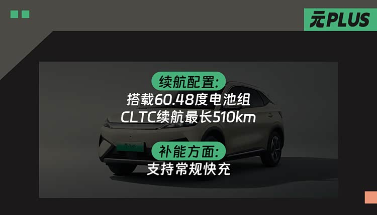 元PLUS:搭載60.48度電池組,CLTC續航最長510km,支持常規快充,30%-80%需30分鐘。