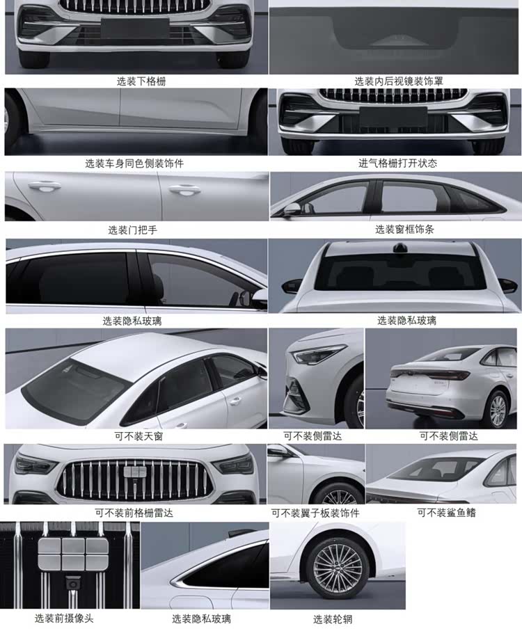 外觀方面,星耀7前臉采用大型梯形格柵搭配豎直鍍鉻飾條,側面保留傳統門把手設計,尾部配備水平尾燈組并嵌入"GEELY"品牌標識。可選配置包括不同樣式的前格柵、輪轂、隱私玻璃以及225/55R18或235/45R19輪胎。