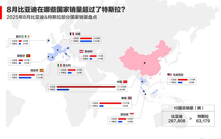 市場數據顯示,比亞迪在全球多個市場表現亮眼。2025年8月,比亞迪在法國、意大利、西班牙等歐洲國家,以及泰國、馬來西亞等東南亞國家的銷量均超過特斯拉。在中國市場,比亞迪8月銷量達27.76萬輛,遠超特斯拉的5.78萬輛。