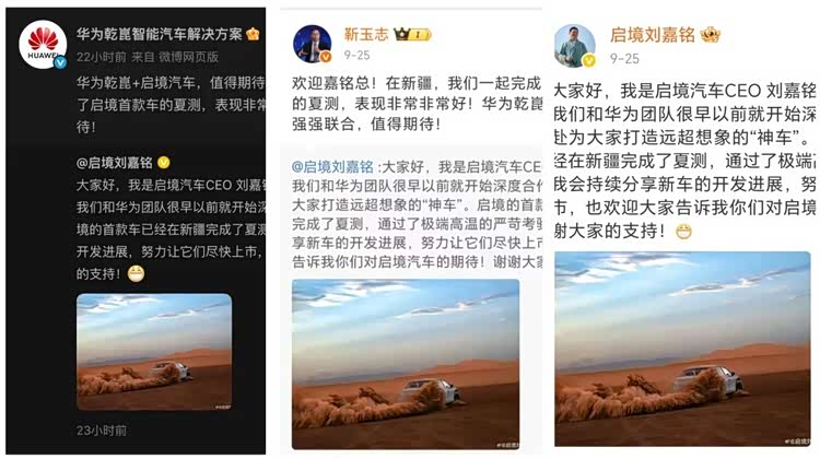 9月26日,啟境汽車CEO劉嘉銘通過微博,公開了啟境首車的開發進展。雙方已組建專業聯合測試團隊,劉嘉銘與華為相關負責人靳玉志兩位CEO親自參與其中,以實際行動推動項目落地。