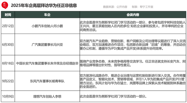 這是今年以來第5位親赴華為的車企一把手。此前,新汽車央企——中國長安汽車董事長朱華榮上任僅11天,便到訪任正非辦公室;廣汽集團董事長馮興亞,小鵬汽車創始人、CEO何小鵬,以及東風汽車董事長楊青也先后率隊前往華為深圳總部,與任正非會面。