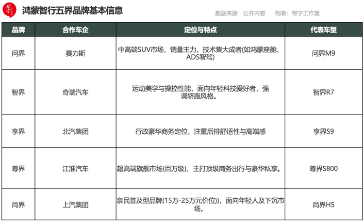 至目前,成績與影響力最突出的,當屬以智選車模式打造的鴻蒙智行“五界”品牌,即分別聯合賽力斯、奇瑞、北汽、江淮、上汽而打造的問界、智界、享界、尊界和尚界。它們覆蓋從親民入門到超豪華旗艦的市場全層級,構建起完整的產品矩陣。