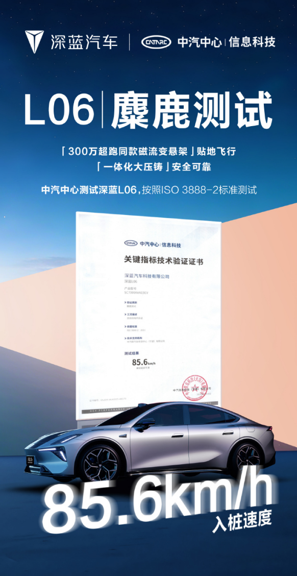 如今隨著新能源汽車快速發(fā)展,車輛自重更重過后,對于底盤懸架調(diào)校更復(fù)雜嚴(yán)苛,就在最近,新央企汽車品牌深藍(lán)汽車的L06在中汽中心完成了一鏡到底的麋鹿測試,麋鹿測試角度、樁桶等細(xì)節(jié)均符合麋鹿測試國標(biāo)(IOS3888-2),最終交出了85.6km/h入樁速度的成績單。