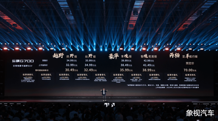 2025年10月19日,以“至 前所未至”為主題的縱橫G700全球上市發(fā)布會在安徽蕪湖宜居國際博覽中心落下帷幕,作為縱橫旗下首款量產(chǎn)車型,新車定位“全領(lǐng)域豪華越野SUV”,共推出4個版型,官方指導(dǎo)價為32.99萬元—41.49萬元,限時超級煥新價30.49萬元起,并帶來十大上市專屬購車權(quán)益,旨在為用戶提供從購車、用車到玩車的全鏈路尊享體驗。