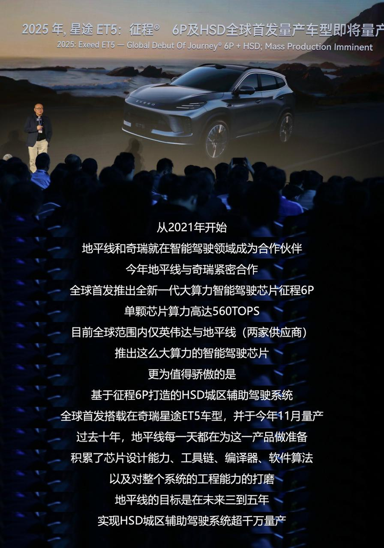 車家號·0瀏覽·2025-10-20 10:18 · 廣東量產版終于要來了!基于征程6P打造的HSD城區輔助駕駛系統,將全球首搭在奇瑞星途ET5車型上,并于11月正式上市,把更安全、更舒適的智能出行體驗,帶給每一個家庭!這意味著地平線HSD也將迎來規模化落地