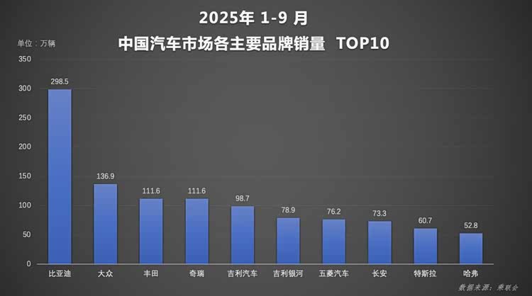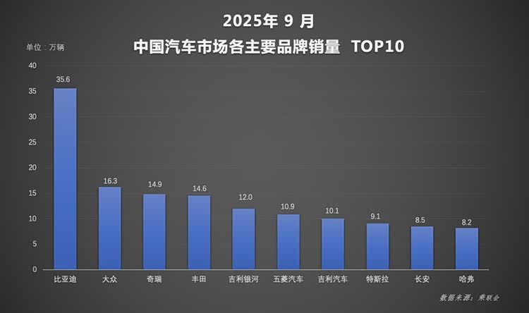 其中,比亞迪汽車(王朝丨海洋)品牌9月銷量達(dá)35.6萬(wàn)輛,1–9月累計(jì)銷量298.5萬(wàn)輛,在全市場(chǎng)單一品牌銷量排名中穩(wěn)居冠軍,頭部地位依然持續(xù)鞏固。