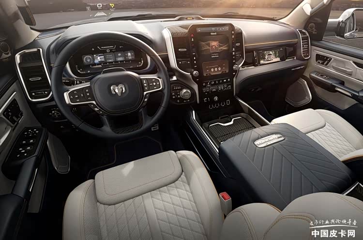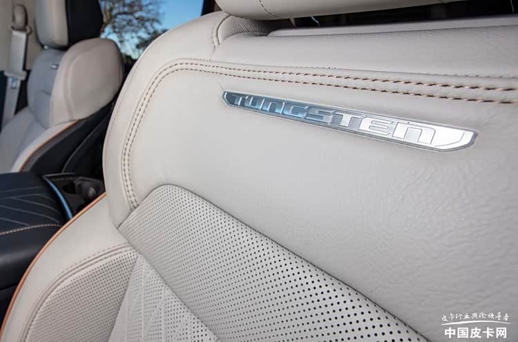 在車內部分,RAM 1500 Tungsten采用實木、碳纖維和金屬等多材質的組合,而除了儀表與中控屏幕,該車還增加了副駕駛娛樂屏。盡管對于廣大中國消費者來說,在車內堆三塊屏幕早已不是什么新奇的事情,但對于美國消費者來說,這樣的三屏搭配依然十分罕見。在舒適性配置上,該車還配備了具有多項調節的真皮座椅,并加入了通風加熱按摩功能。此外,該車還配備了杰士Reference Premiere 23揚聲器音響系統,這是一個來自美國的高端音響品牌,其總功率可以超過1200W,為該車提供了遠超其他車型的音響效果。