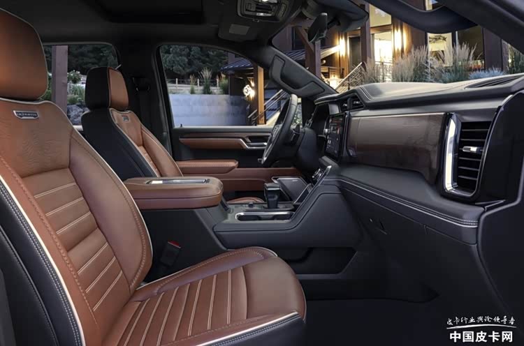 該車的內飾裝潢十分講究,它配備了精美的激光蝕刻開孔木飾、帶圖案的鋁制內飾飾板以及被稱作“鍛造穿孔”的真皮座椅。而除了常規功能外,還具備了按摩功能。同時還配備了來自Bose高端系列的音響系統,音質出色。此外,它也同樣配備了在皮卡世界中領先的 “Super Cruise”超級續航系統,可以在高速公路和許多雙車道公路上實現高階的智能駕駛輔助功能,其自動化豪華程度甚至超過了目前的 S 級轎車。