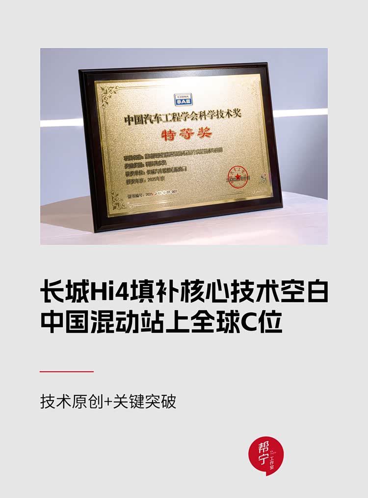2025年10月22日,長城汽車“混動四驅智能越野系列乘用車關鍵技術與應用”項目,憑借在動力性能、電池安全、越野性能等關鍵領域的突破性創新成果,填補了多個全球技術空白,一舉斬獲“中國汽車工程學會科學技術獎特等獎”。這是國家科學技術獎勵工作辦公室批準的汽車行業權威獎項。