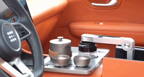 此次新車主打“輪上三室一廳”,車內提供睡眠、茶飲、娛樂、餐廚四大場景,后備箱配有可放置充氣床墊的收納處,以及雙向的投影幕布;駕駛位中控臺還有隱藏式一體式即熱飲水機。此外,該車的后備箱位置還罕見帶有抽拉式餐桌,帶有雙 1500W 電磁爐。