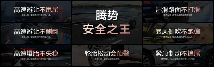 主動安全方面,得益于易三方,騰勢N8L能夠以128km/h高速避讓不甩尾、210km/h高速避讓(魚鉤測試)不側翻、180km/h高速爆胎不失穩、154km/h暴風側吹不跑偏、147km/h AEB自動緊急制動、不怕雨雪路面打滑、車輪松動監測系統,以科技安全守護家人出行安心。騰勢汽車不愧被稱為新能源汽車的“安全之王”。