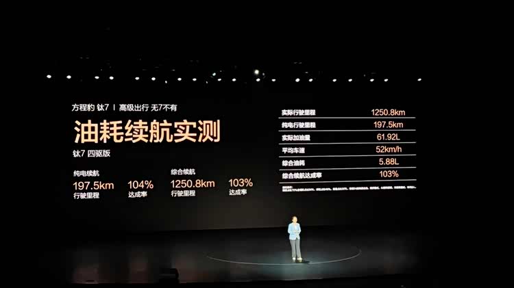 正因為有著方程豹前期的積累,了解了越野和高負荷等工況,這才可以去釋放新一代DM的低能耗優勢,同時又能保證性能的穩定。在發布會上,104%的純電續航達成率,103%的綜合續航達成率,這都是用戶信心的來源。