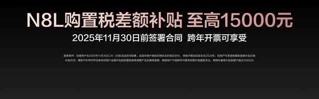 為回饋廣大用戶的支持與信賴,騰勢N8L特別推出限時購車權益,權益價值至高10.67萬元!包括價值1.7萬元的三年免息,最高1萬元的置換補貼。此外,不必擔心因為交車晚,享受不到購置稅補貼:在2025年11月30日24點前完成合同簽署的用戶,如果因非用戶原因車輛未及時交付,導致開票實際發生在2026年,可享受購置稅差額補貼,最高1.5萬元!