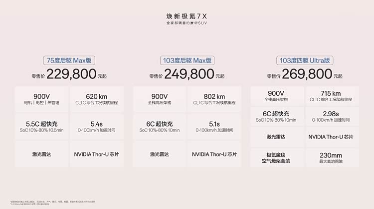 最性能的家庭豪華SUV。煥新極氪7X全系搭載900V的電機(jī)、電控和熱管理系統(tǒng),續(xù)航、補(bǔ)能、動(dòng)力皆有所優(yōu)化,整體實(shí)力全面領(lǐng)先一代。75kWh的5.5C神盾金磚電池版型,充電10min續(xù)航增加425km。103kWh的6C麒麟電池版型,峰值充電功率高達(dá)620kW,擁有同級(jí)最快充電速度,SoC10%至80%最快僅需10min,CLTC綜合工況續(xù)航最高達(dá)到802km。四驅(qū)車型搭載高性能碳化硅電驅(qū)系統(tǒng),峰值功率達(dá)到585kW,最大扭矩達(dá)到812N·m,0-100km/h加速最快僅需2.98s,最高車速達(dá)到255km/h。