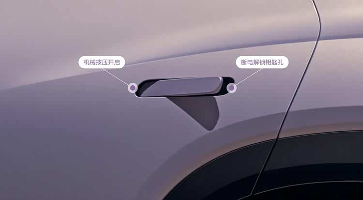 細節上,車輛配備雙模隱藏式門把手,具備電動開啟和手動按壓兩種模式,支持在車輛斷電、-40°C低溫、側翻、涉水等極端情況下可依靠機械鏈路直接解鎖。該門把手還能在碰撞觸發時自動彈出,規避因電控短路導致無法打開的風險。
