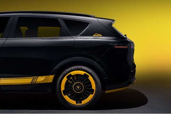 新車配備20英寸流光馭風輪轂,采用黑色輪輻與流金色輪輞的撞色設計,搭配黃色制動卡鉗,在行駛中呈現環繞式光影效果,增強視覺動感。