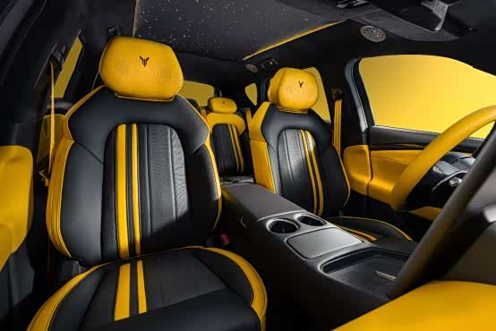 內飾方面,嵐圖FREE+運動定制版采用玄金雙拼撞色設計,儀表臺、門板、方向盤及座椅等區域以黃色超纖材質包覆,A/B/C柱與頂棚則選用仿麂皮面料,營造兼具激情與豪華的座艙氛圍。NAPPA環抱式運動座椅采用頭層牛皮材質,結合人體工學設計,提供出色的支撐性與包裹感。暗影啞光碳纖維組件覆蓋外后視鏡、內飾面板等區域,進一步強化運動氛圍。