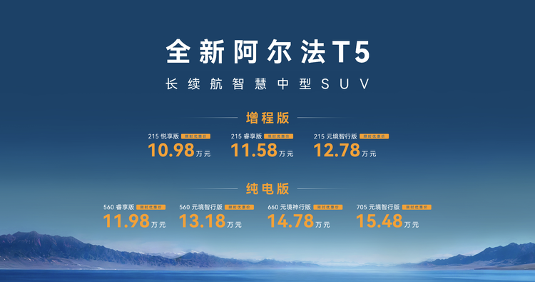 全新阿爾法T5以極具攻擊性的價格策略震撼市場。增程版3款車型官方售價11.38萬元-13.18萬元,限時優惠后10.98萬元-12.78萬元;純電版4款車型官方售價12.38萬元-15.88萬元,限時優惠后11.98萬元-15.48萬元。