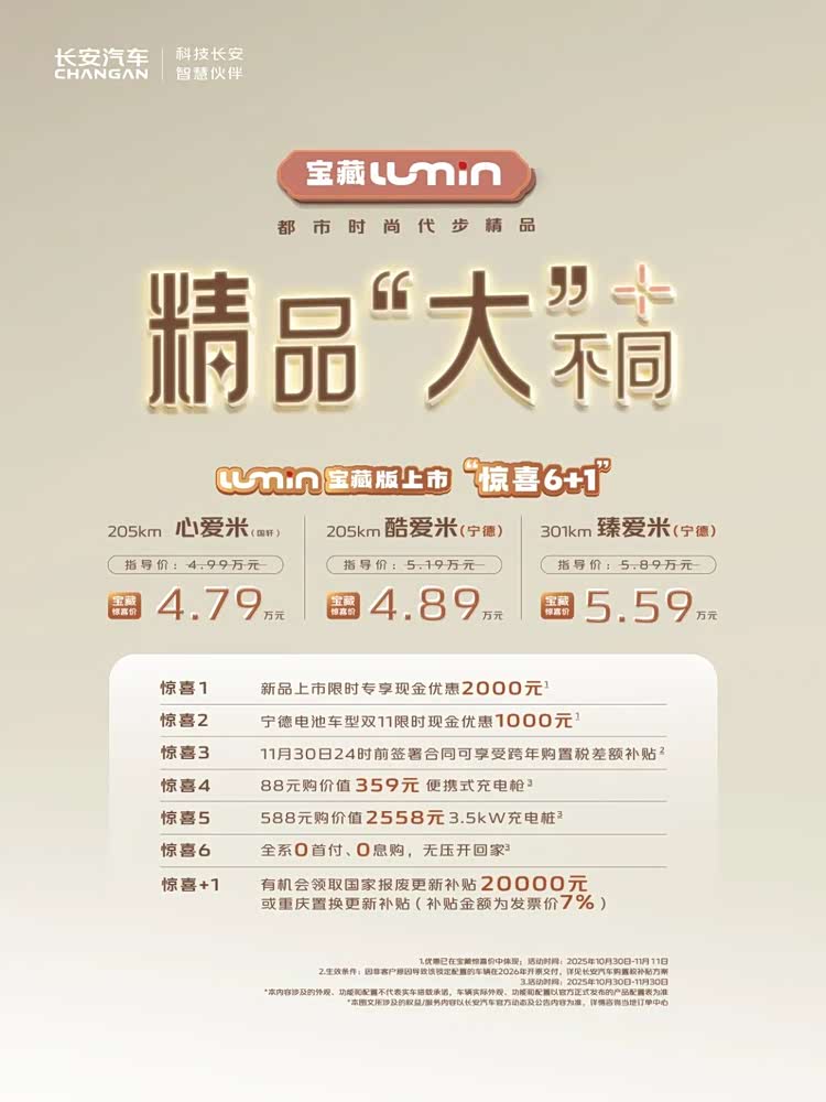 10月30日, 長安Lumin(參數|詢價)寶藏版正式上市,推出心愛米、酷愛米、臻愛米三個配置,官方售價4.79萬-5.59萬,同步推出“驚喜6+1”購車大禮,降低購車門檻。