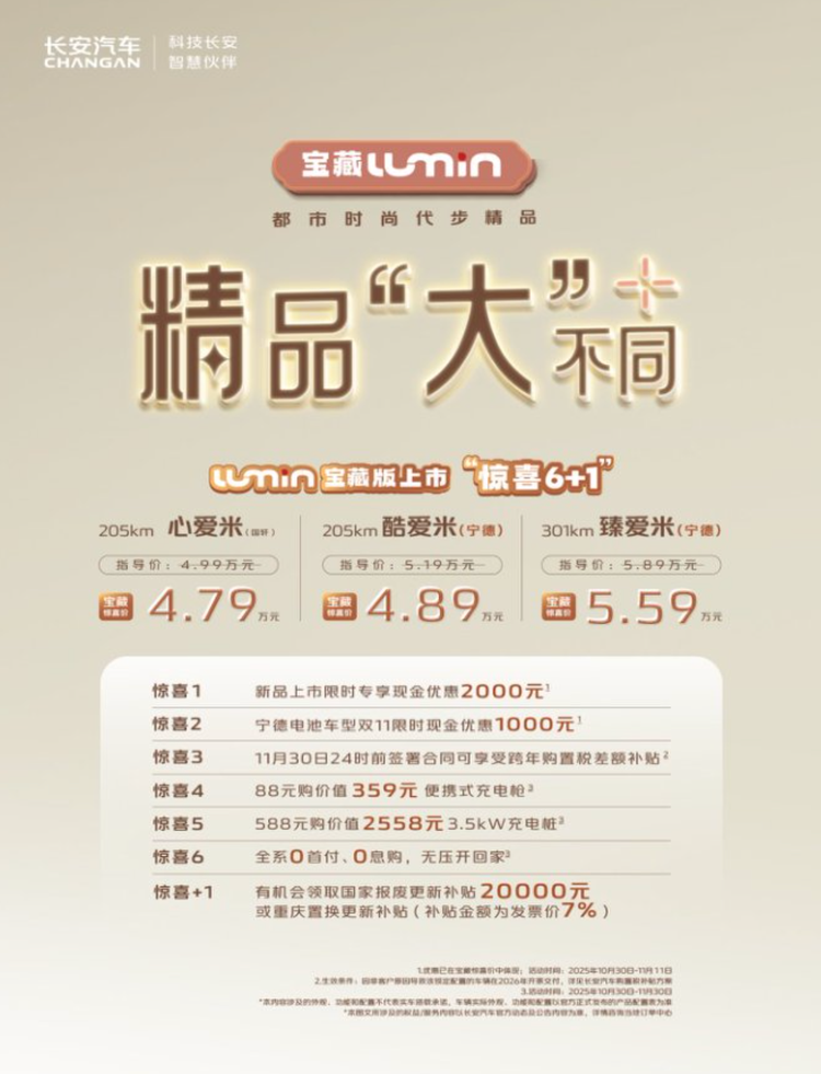 就在最近,定位“都市時尚代步精品”的Lumin寶藏版正式上市,共推出心愛米、酷愛米、臻愛米三個配置,官方驚喜價4.79-5.59萬。同時為回饋用戶,還同步推出極具誠意的“驚喜6+1”大禮,購車門檻大幅降低。