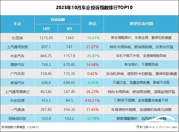 10月車企投訴TOP10榜單中,比亞迪仍位居榜首,上汽通用別克超過長安汽車排在第二,理想、廣汽本田、奇瑞汽車、上汽通用雪佛蘭緊隨其后。10月,比亞迪、長安、奇瑞等投訴大戶投訴指數均不同幅度下降,此前遭遇集中投訴的阿維塔投訴指數大幅下降了三成,一汽紅旗已經跌出榜單。值得一提的是,長安啟源成了最大黑馬,投訴指數翻了四倍多,啟源Q07以一己之力將啟源推進了前十。