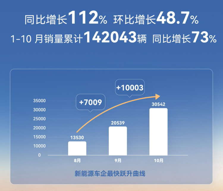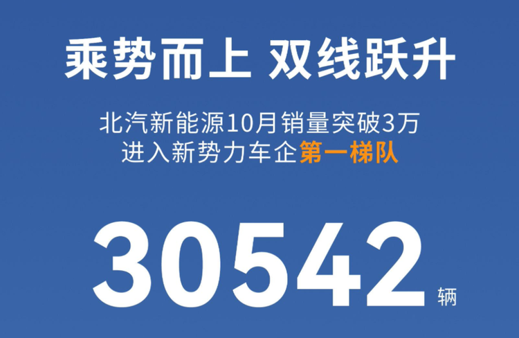 官方數(shù)據(jù)顯示,北汽新能源10月單月銷量首次突破3萬臺大關(guān),達到30542臺,同比勁增112%;今年1—10月累計銷量達到142043臺,同比增長73%。