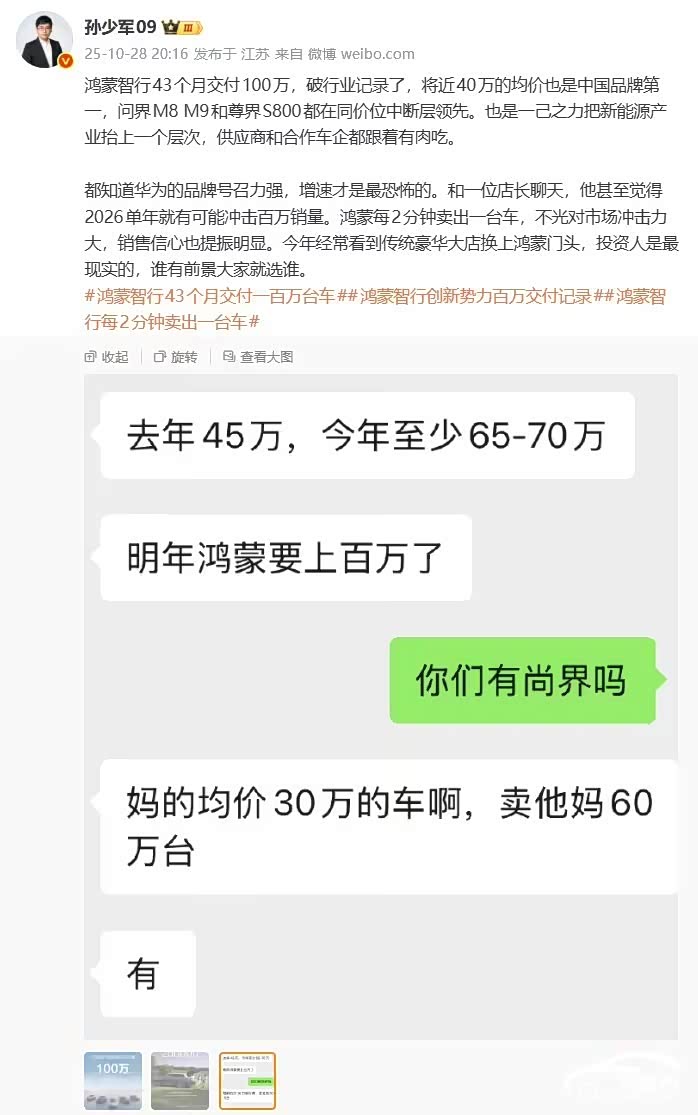 知名大V孫少軍透露,鴻蒙智行43個月交付100萬,破行業記錄了,將近40萬的均價也是中國品牌第一,問界M8 M9和尊界S800都在同價位中斷層領先。他還表示,一位店長甚至覺得2026單年就有可能沖擊百萬銷量。