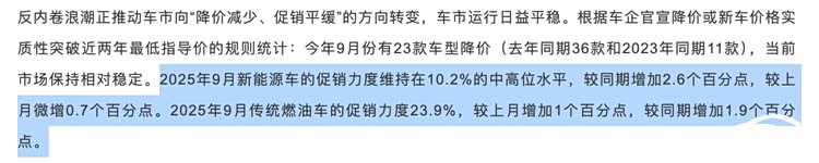 乘聯分會最新數據顯示,今年 9 月,我國新能源車的促銷力度維持在10.2% 的中高位水平,較同期增加 2.6 %,較上月微增 0.7%;今年 9 月,我國傳統燃油車的促銷力度 23.9%,較上月增加 1%,較同期增加 1.9%。
