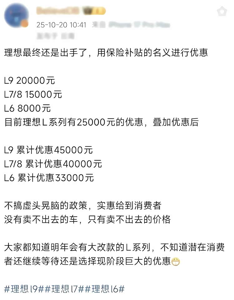 今年10月20日,某三方網絡平臺一位汽車博主透露,理想汽車將以“保險補貼”名義針對理想L系列推出優惠,疊加現有政策后,理想汽車的L系列全系車型最高可優惠4.5萬元。