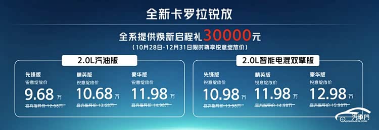 老牌合資車企也不落伍。一汽豐田官方在10月28日正式上市新款卡羅拉銳放。新車售價區間為12.68-15.98萬元,限時銳意綻放價直降3萬元,銳意綻放價區間9.68-12.98萬元。