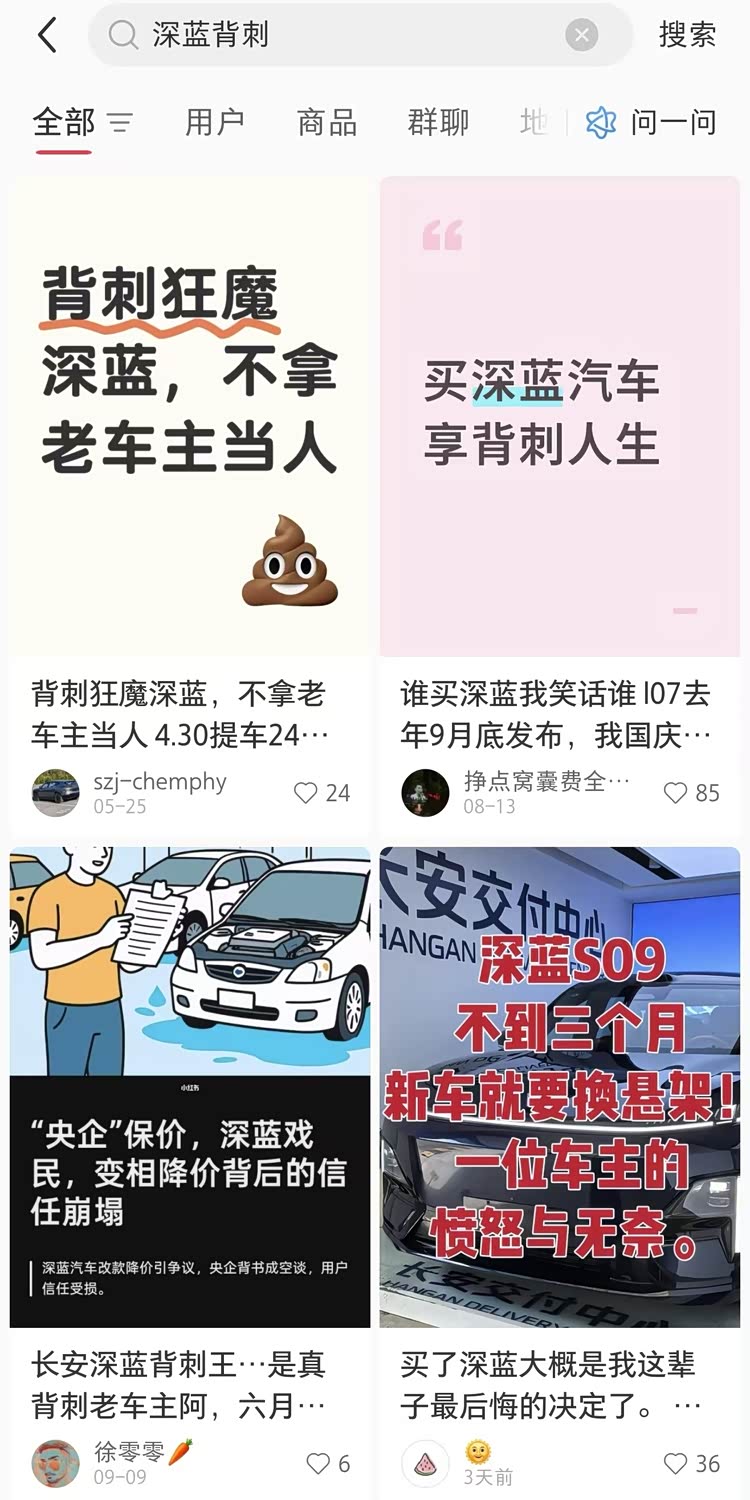 除內(nèi)部競(jìng)爭(zhēng)外,深藍(lán)汽車還需摘掉“背刺”標(biāo)簽。打開(kāi)搜索引擎,以“深藍(lán)背刺”為主題的帖子數(shù)不勝數(shù),內(nèi)容普遍指向深藍(lán)汽車變相或公然降價(jià)的行為,涉及包括深藍(lán)S07、S09、SL03以及G318等幾乎所有熱門車型。