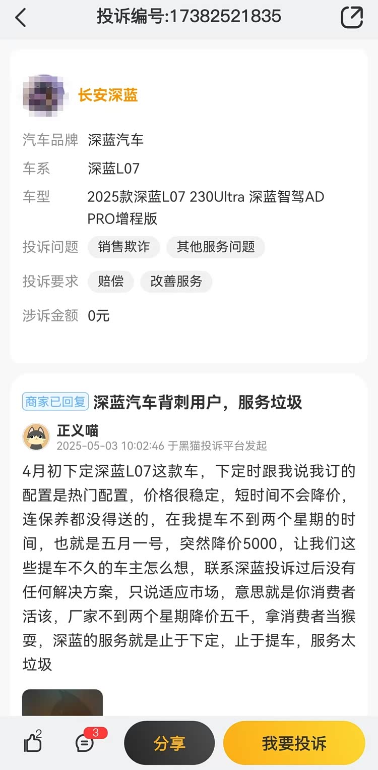 黑貓投訴平臺(tái)上,與這一話題相關(guān)的投訴也是絡(luò)繹不絕。一位深藍(lán)L07車主表示,“4月初下定,下定時(shí)說(shuō)訂的是熱門配置,價(jià)格很穩(wěn)定,短時(shí)間不會(huì)降價(jià),連保養(yǎng)都沒(méi)送。提車不到兩個(gè)星期,5月1日突然降價(jià)5000。聯(lián)系深藍(lán)投訴過(guò)后沒(méi)有任何解決方案,只說(shuō)適應(yīng)市場(chǎng)。意思就是你消費(fèi)者活該,拿消費(fèi)者當(dāng)猴耍,深藍(lán)的服務(wù)就是止于下定,止于提車,服務(wù)太垃圾。”