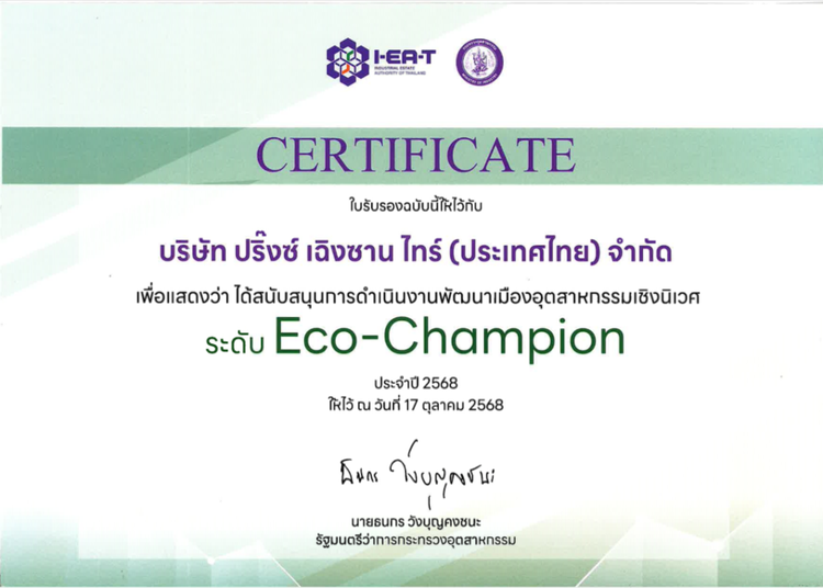 在近日IEAT工業廳開展的例行檢查中,檢查組對公司整改落實情況予以充分肯定,并授予由泰國工業部長簽發的“Eco-Champion”證書,以表彰公司在積極配合工作中的突出表現。