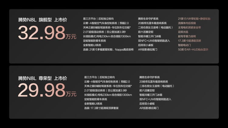 N8L依然延續(xù)了騰勢一貫的簡明產(chǎn)品布局,只推出了29.98萬的尊榮型和32.98萬的旗艦型兩款。旗艦型主要增加了8項舒適性配置,其中副駕零重力座椅、二排17.3英寸超清吸頂屏、智能電動門是用戶最看重的三項,也正因這三項配置,購買N8L的用戶大多數(shù)都選擇了旗艦型。