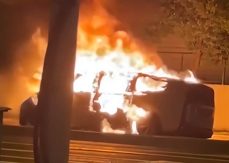 底盤迸發火花,短短10秒鐘內連續發生爆炸,迅速爆燃的熊熊大火吞噬了整個車身。